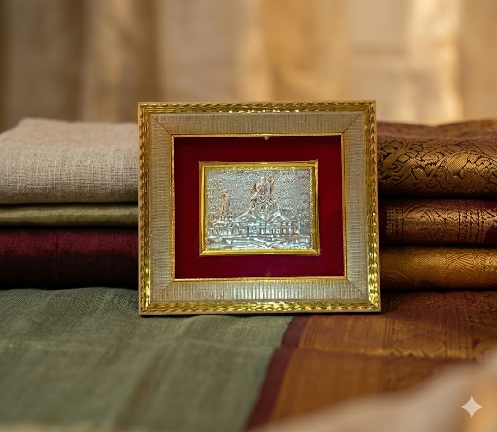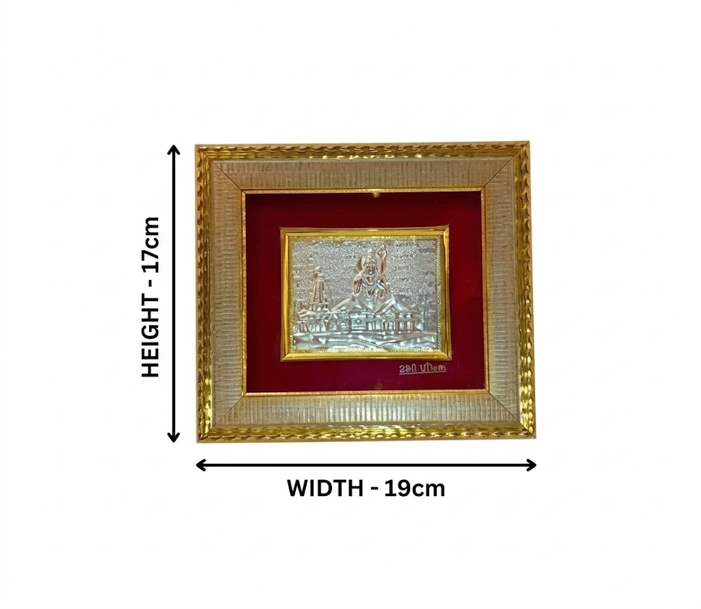 Bring home a touch of spirituality and elegance with this beautifully crafted Divine Silver Temple Frame. Designed with intricate detailing, the centerpiece features a finely embossed silver-toned temple artwork that radiates devotion and serenity. The rich red velvet background enhances the divine presence, making it a perfect addition to your home temple, living room, or office space.