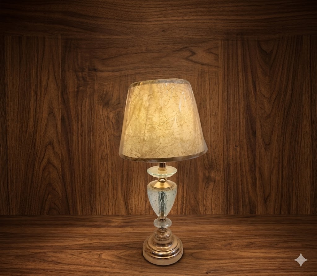 The lamp features a beautifully crafted base combining a metallic gold finish with a decorative glass centerpiece, creating a refined and luxurious look. The highlight of this piece is its premium textured lampshade in warm golden tones, which softly diffuses light to create a cozy and inviting atmosphere.