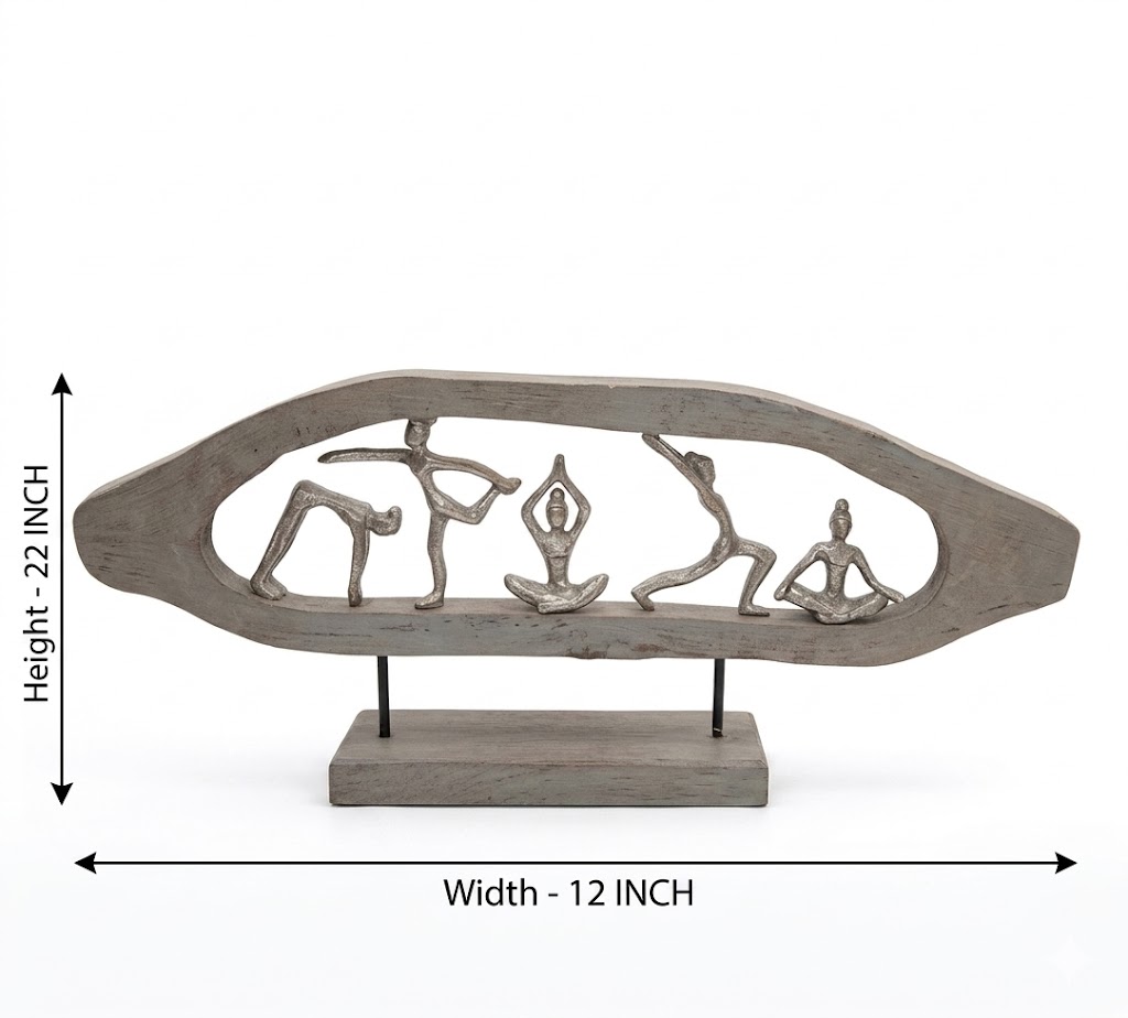 The sculpture features multiple abstract human figures performing different yoga poses, symbolizing harmony, mindfulness, and inner strength. These finely crafted metallic figures are enclosed within a rustic wooden frame, creating a perfect blend of natural texture and modern artistry. The balanced contrast between the wooden structure and metallic finish enhances its visual appeal, making it a standout decorative accent.