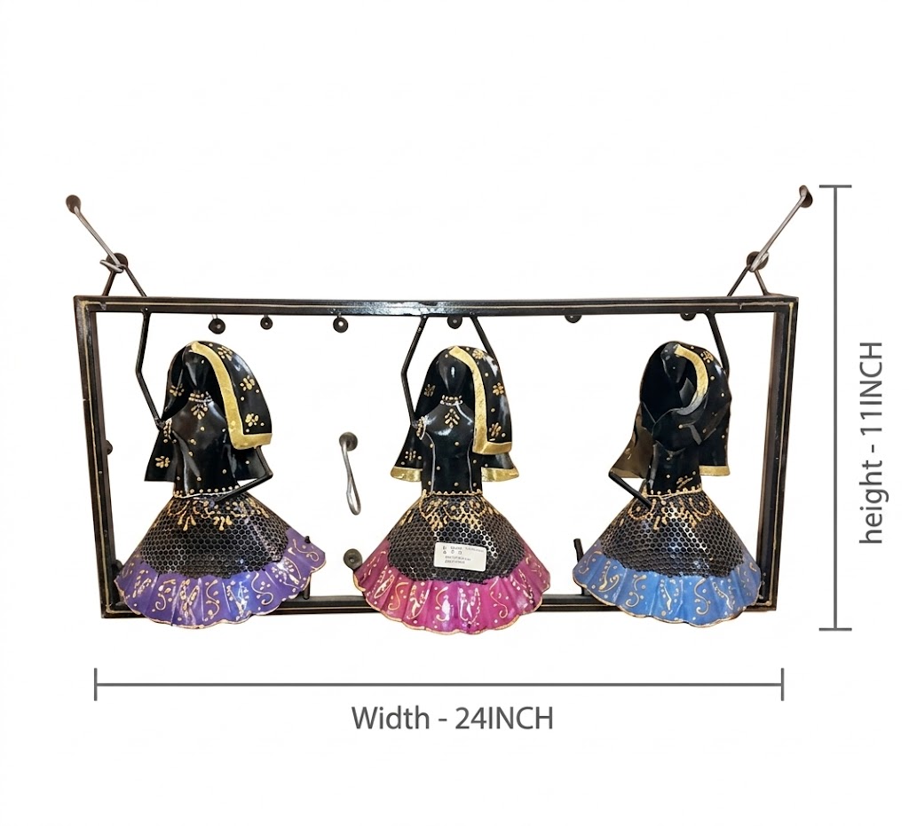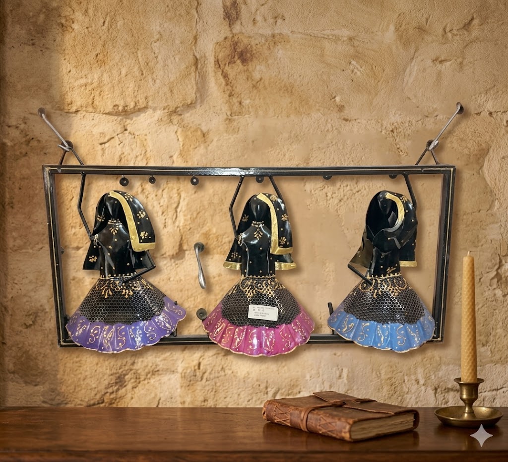 Add functionality with a touch of traditional elegance to your space with this beautifully designed Lady Hooks Wall Hanging Key Holder. Featuring three artistically crafted figurines of traditional women in vibrant attire, this décor piece perfectly blends utility with cultural charm. Each figure is adorned with intricate detailing, showcasing graceful silhouettes and colorful skirts in shades of purple, pink, and blue with golden accents.