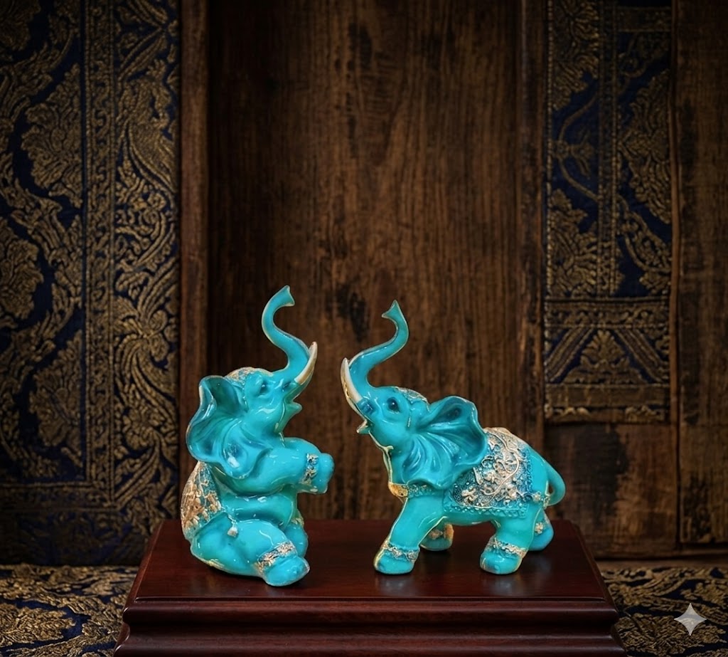Enhance your décor with charm and positivity with this elegant Royal Turquoise Elephant Duo. This beautifully crafted set features two intricately designed elephants in vibrant turquoise color, symbolizing strength, wisdom, and good luck. With their trunks raised upward, these elephants represent prosperity, success, and positive energy flowing into your space.