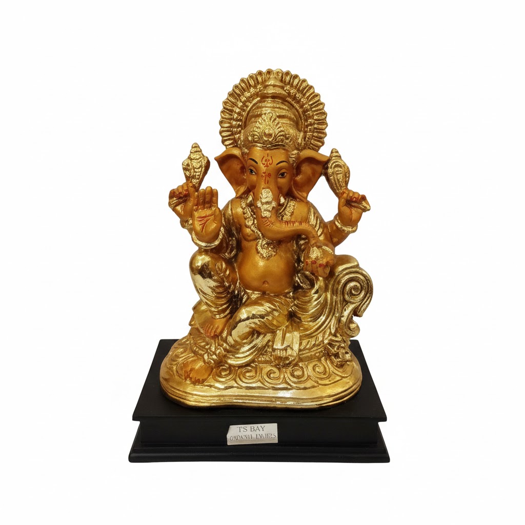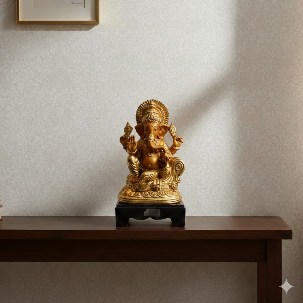Elevate your space with this stunning, handcrafted Lord Ganesha idol. Radiating spiritual energy and refined craftsmanship, this piece features a brilliant metallic gold finish that captures light beautifully from every angle.