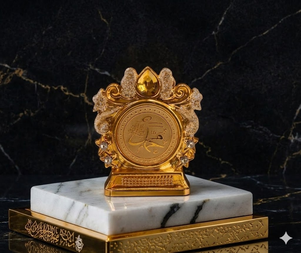 This is an ornate decorative plaque crafted in a rich gold finish, designed to highlight Islamic heritage and artistry. At the center, a circular medallion features elegant Arabic calligraphy spelling the name “Muhammad” (ﷺ), the Prophet of Islam. The inscription is finely engraved, giving it both visual depth and spiritual significance.