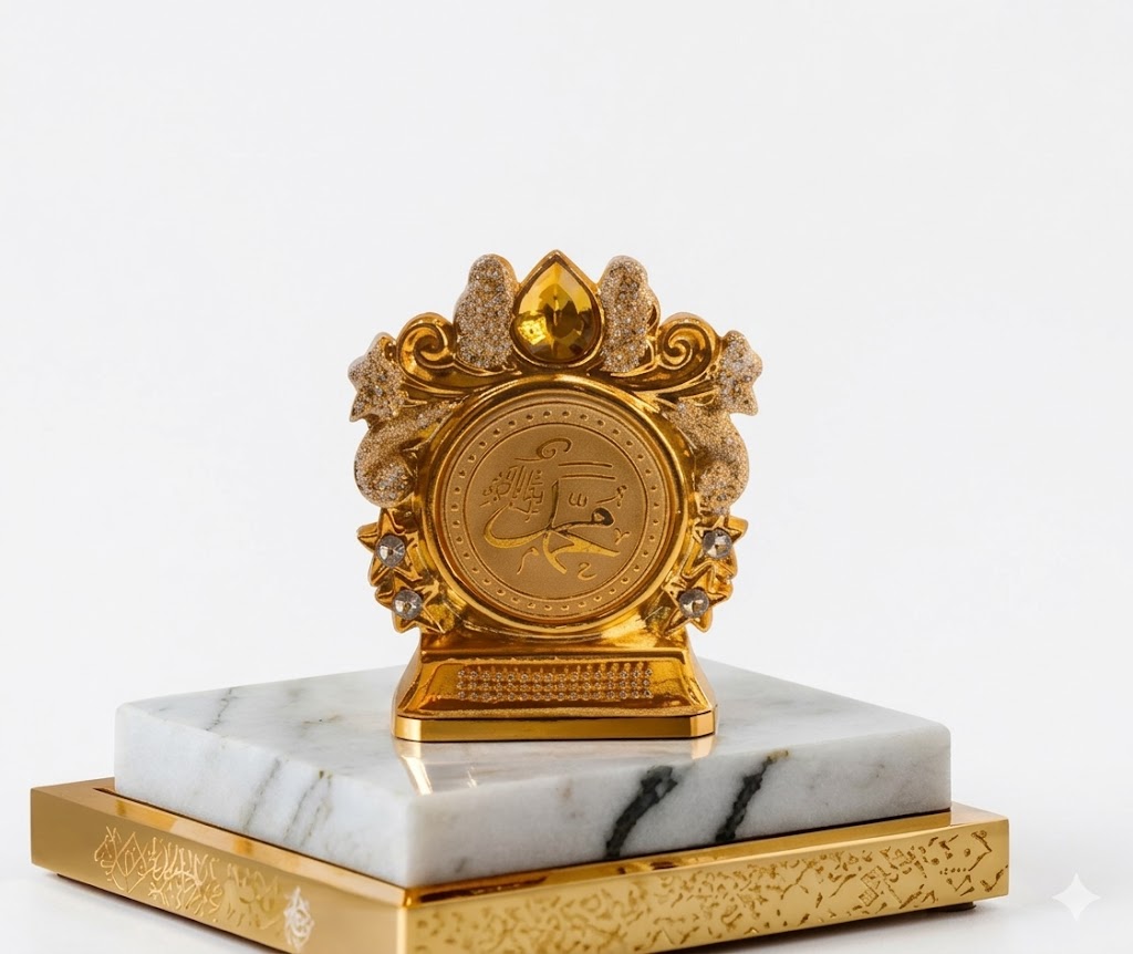 The plaque is mounted on a sturdy rectangular base with textured detailing, which sits on a polished marble platform. The marble base provides contrast with its smooth white surface and natural dark veining, complementing the gold structure above. Beneath the marble, a gold-trimmed foundation with subtle Arabic-style patterns adds another layer of refinement.