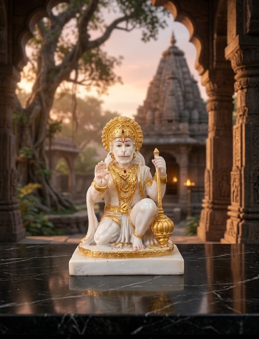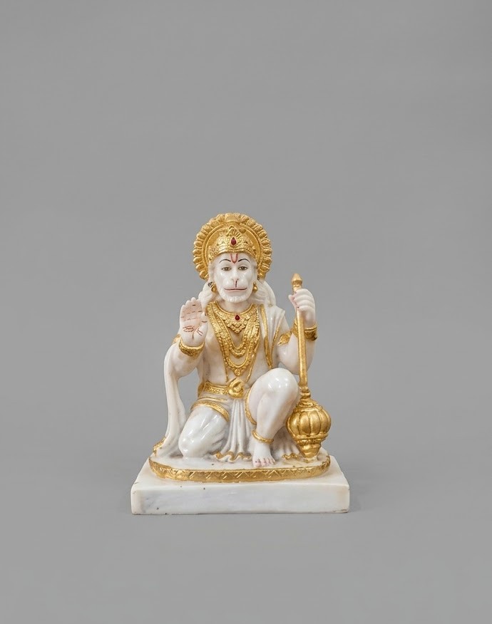 Bring home strength, devotion, and divine protection with this exquisitely crafted idol of Lord Hanuman. Made from premium marble with elegant golden detailing, this statue beautifully captures the powerful yet humble presence of Bajrangbali. Seated in a calm yet ready posture, holding his sacred mace (gada), the idol symbolizes courage, loyalty, and unwavering faith.