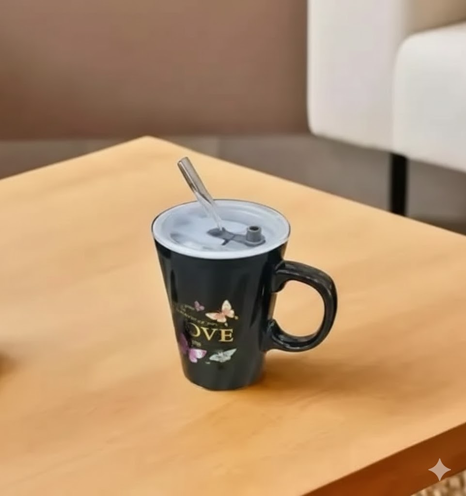 Design: The mug is adorned with vibrant, multi-colored butterflies and the word “LOVE” in a classic gold-tone font, creating a beautiful contrast against the dark background.