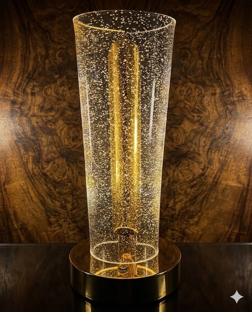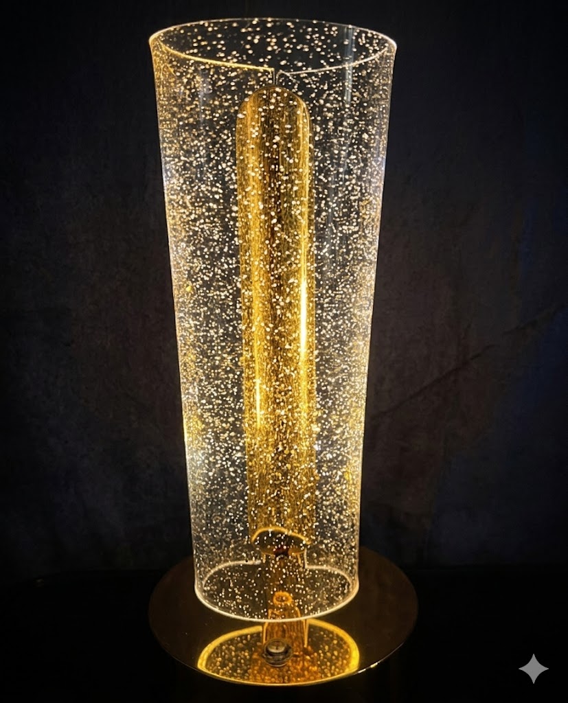 Add a touch of luxury and warmth to your space with the Golden Sparkle LED Cylinder Table Lamp. Designed with a sleek transparent cylindrical body, this lamp is filled with thousands of tiny shimmering light particles that create a mesmerizing starry effect when illuminated. The elegant golden glow from the central LED tube enhances the overall ambiance, making it perfect for modern homes, offices, and decorative setups.