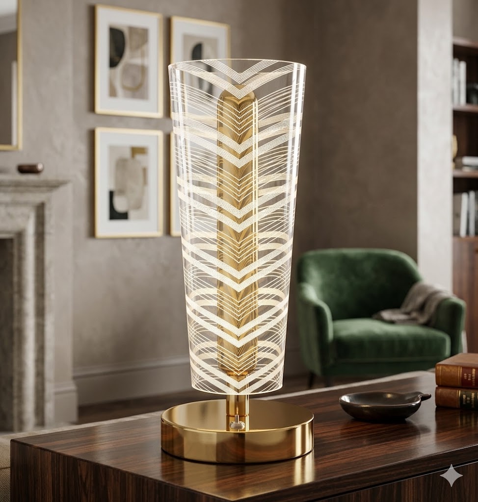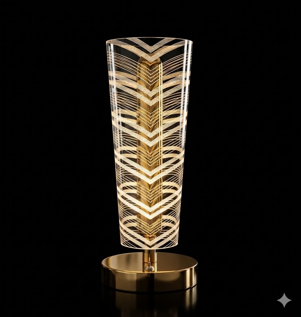 Elevate your interior décor with the sophisticated charm of the Royal Chevron Glow LED Table Lamp. Featuring a sleek golden base and a beautifully crafted transparent shade adorned with elegant chevron patterns, this lamp brings a perfect blend of modern design and timeless luxury.