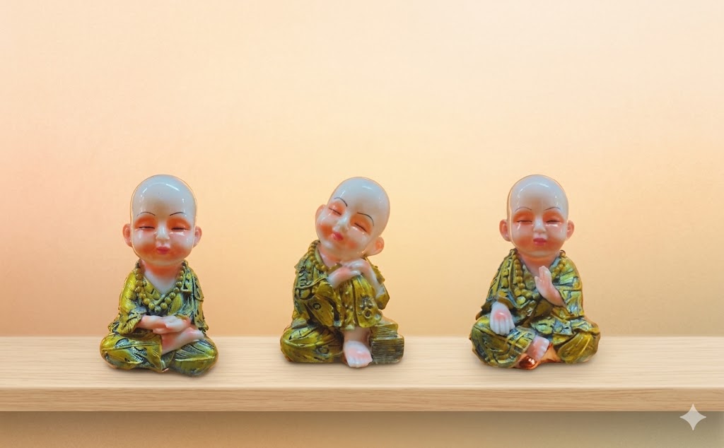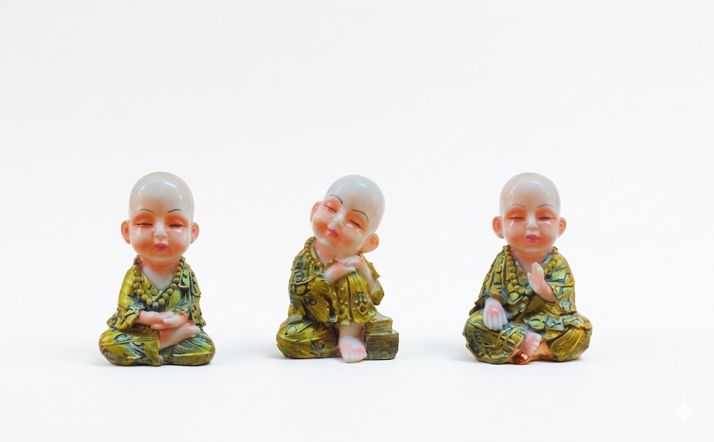 This decorative figurine set features three serene monk figures, each embodying the timeless moral philosophy of “See No Evil, Hear No Evil, Speak No Evil.” Crafted with a smooth, glossy finish, each monk is depicted in a calm seated posture with gentle facial expressions and closed eyes, symbolizing peace, mindfulness, and spiritual discipline.