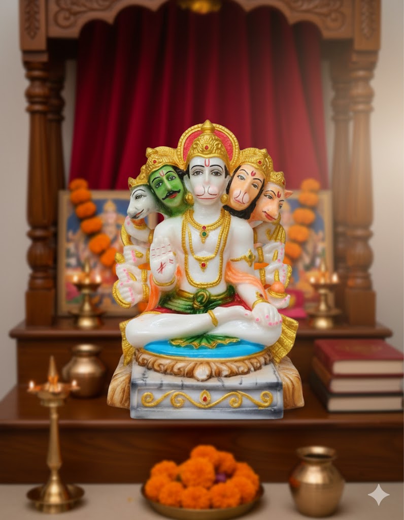Bring divine blessings to your home with this beautifully crafted Panchmukhi Hanuman Statue. The sacred five-faced form of **Hanuman symbolizes protection, strength, and positivity. Perfect for home temples, पूजा rooms, office décor, and spiritual gifting.
