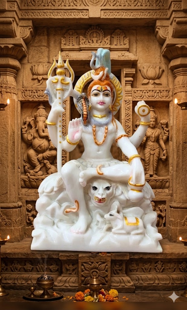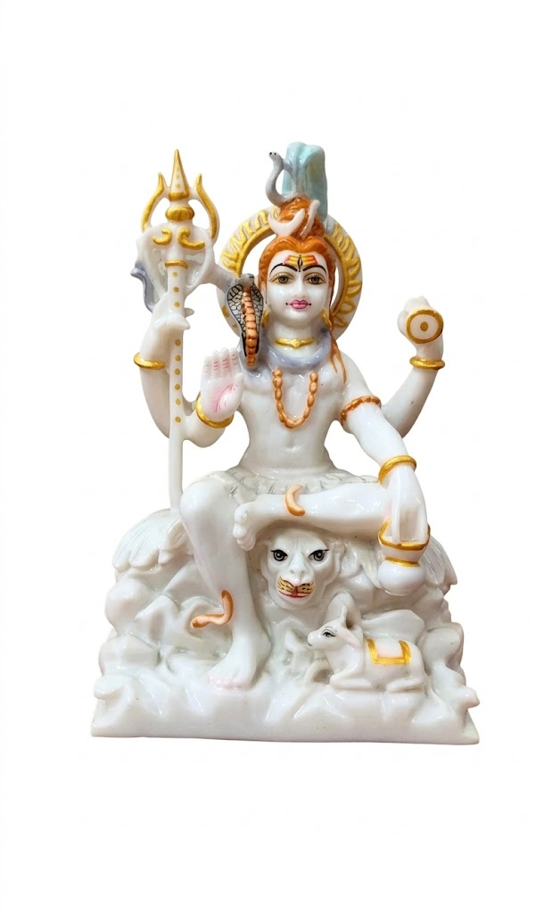 This is a finely crafted idol of Lord Shiva, one of the principal deities in Hinduism, revered as the destroyer and transformer within the Trimurti (trinity). The statue depicts Shiva in a serene seated posture, symbolizing peace, meditation, and supreme consciousness.