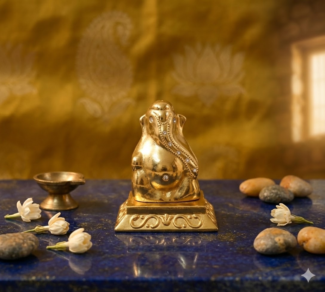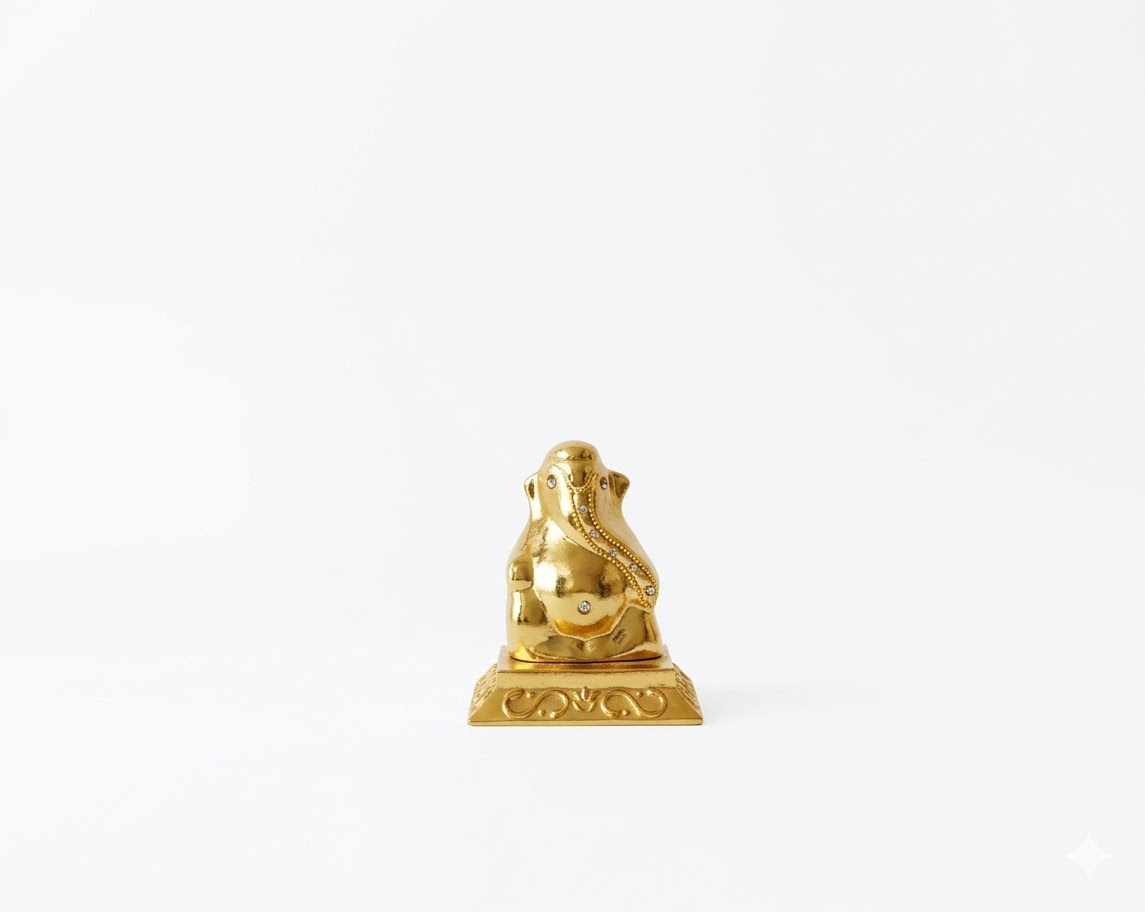 Sitting atop a detailed, scroll-work pedestal, this idol captures the essence of Lord Ganesha—the bringer of wisdom, prosperity, and the remover of obstacles. Its miniature size makes it a versatile addition to any setting, blending traditional craftsmanship with a modern, premium aesthetic.