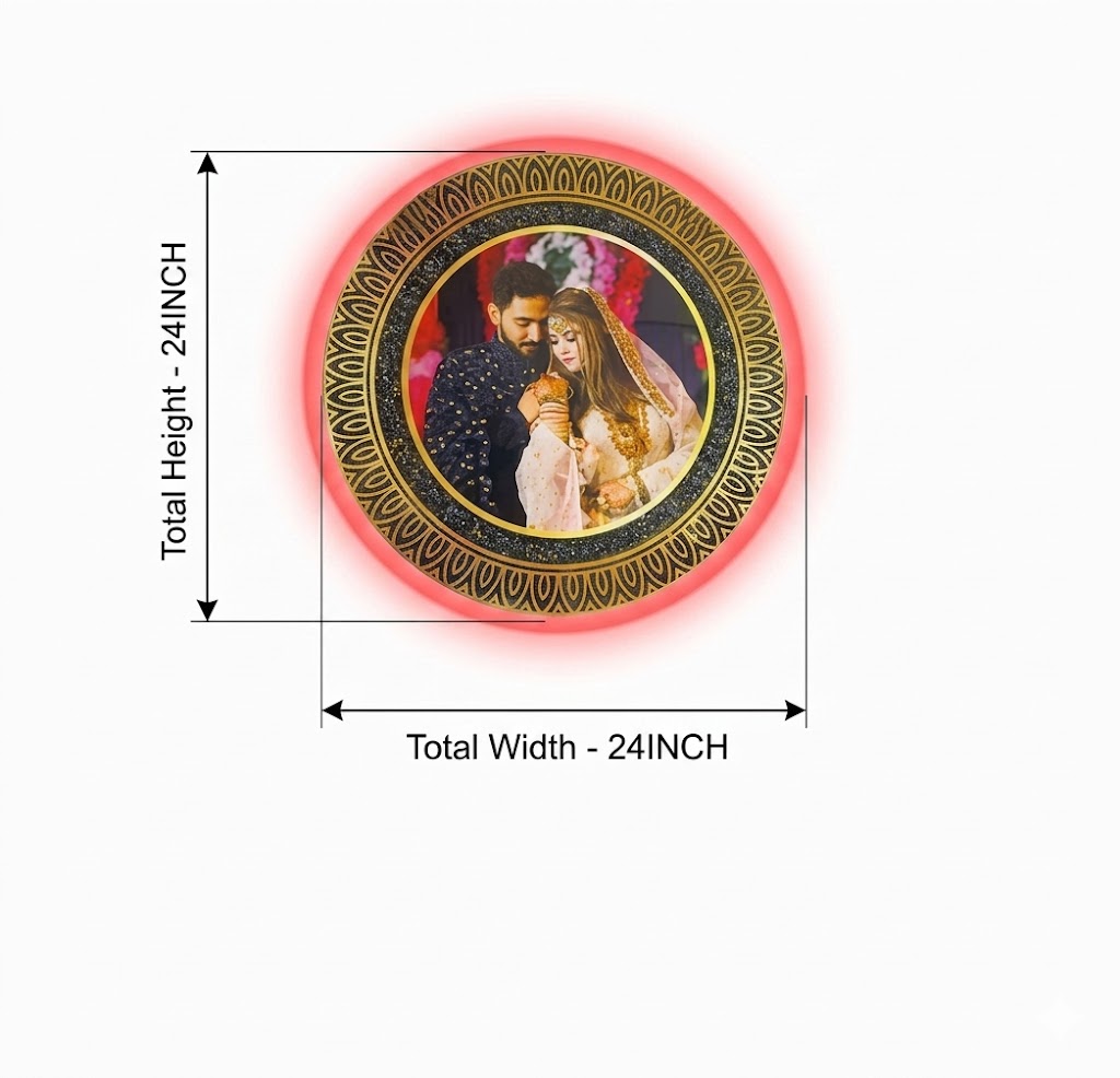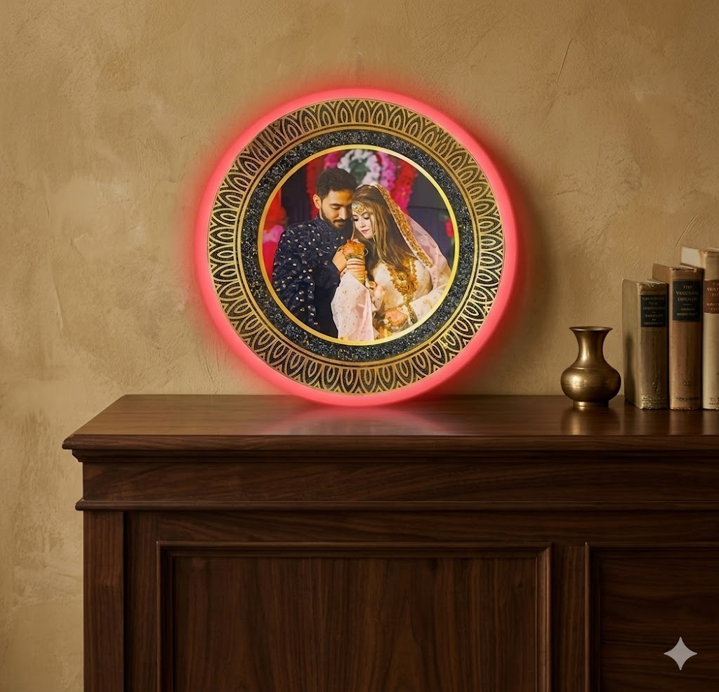 Surrounded by an intricately patterned golden border, the frame showcases fine detailing that exudes richness and sophistication. The outer ring is enhanced with a subtle textured finish, adding depth and visual appeal. What truly sets this piece apart is the integrated soft LED backlight, which creates a warm glowing halo effect around the frame, making your photo stand out beautifully even in low-light settings.