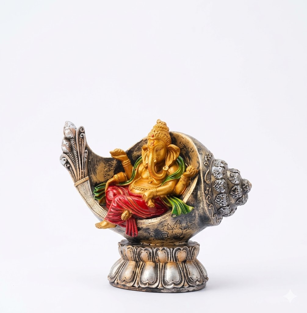 This intricately crafted decorative idol features Lord Ganesha, the revered remover of obstacles and symbol of wisdom, prosperity, and new beginnings in Hindu tradition. The deity is depicted in a relaxed, reclining posture inside a stylized conch shell (Shankha), which itself holds deep spiritual significance as a symbol of purity, auspiciousness, and divine sound in Indian culture.