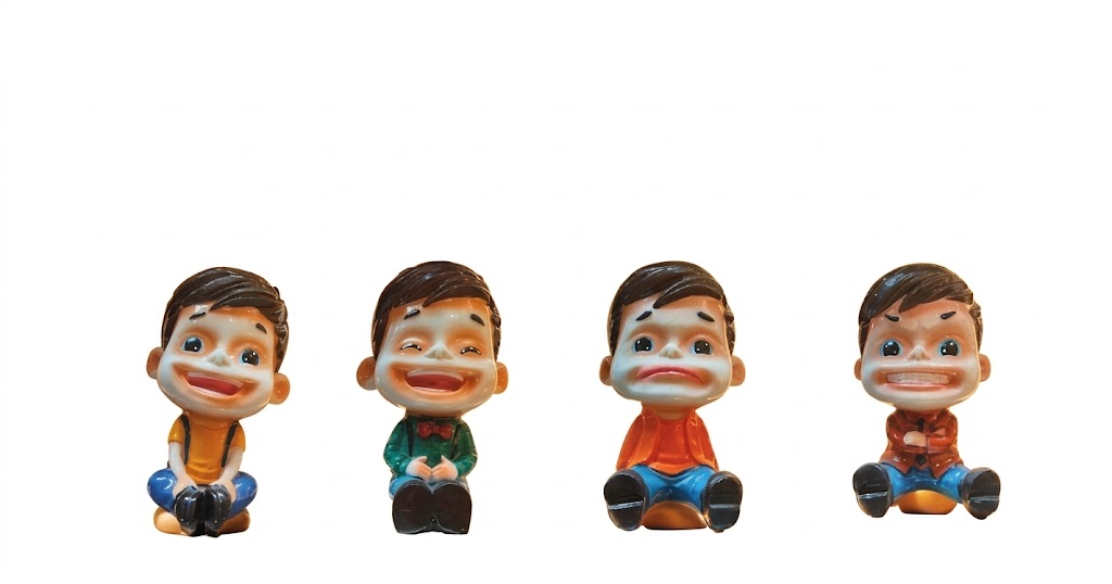 From left to right, the first figurine displays a cheerful, happy expression with a wide smile and bright eyes, conveying joy and positivity. The second figurine appears content and relaxed, with a gentle smile and calm posture, suggesting peace or satisfaction. The third figurine portrays sadness, with teary eyes and a downturned mouth, evoking sympathy and emotional depth. The fourth figurine shows anger or frustration, with furrowed brows and a tense expression, capturing a more intense emotional state.
