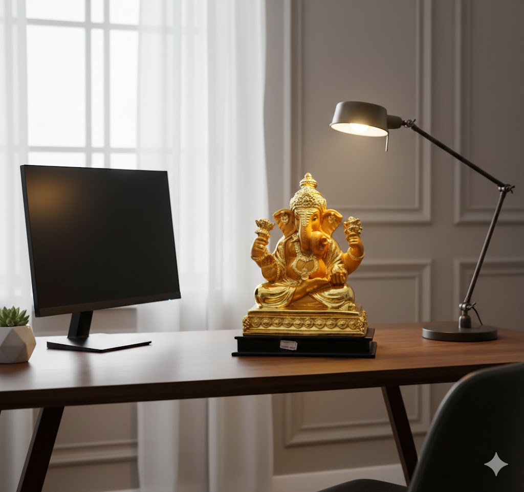 Mounted on a sturdy base, this idol is perfect for home temples, offices, or as a decorative centerpiece that brings positivity and harmony to any space. Ideal for daily पूजा, festive occasions, or gifting, it serves as a meaningful symbol of शुभ लाभ (good fortune) and divine blessings.