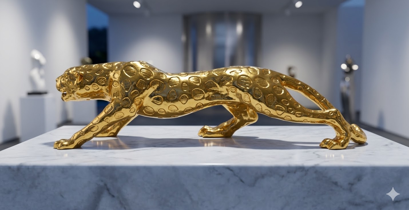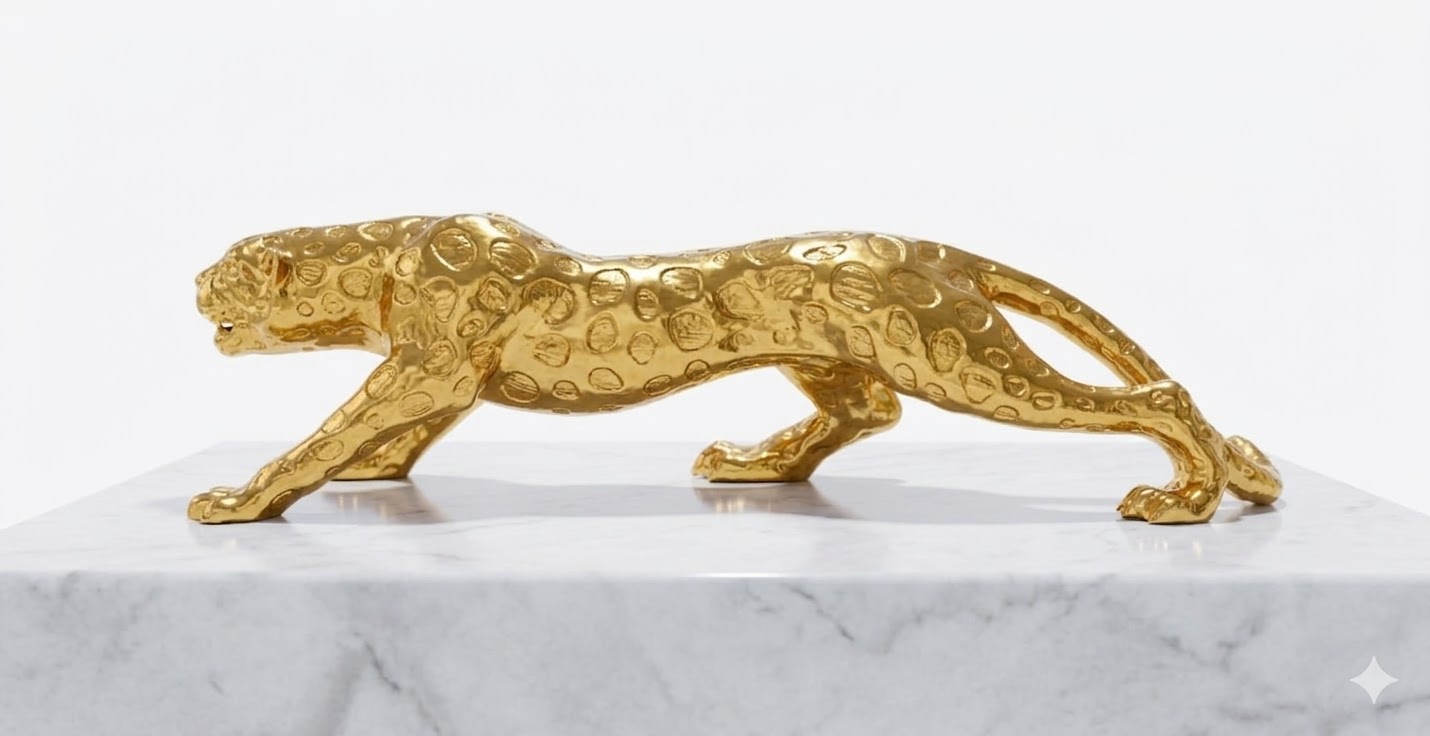 Make a bold and luxurious statement with this striking golden leopard sculpture, a perfect blend of elegance and power. Expertly crafted, the piece captures the dynamic motion of a leopard in mid-stride, symbolizing strength, agility, and grace. Its elongated form and poised stance convey a sense of movement, making it a captivating centerpiece for any modern or classic interior.