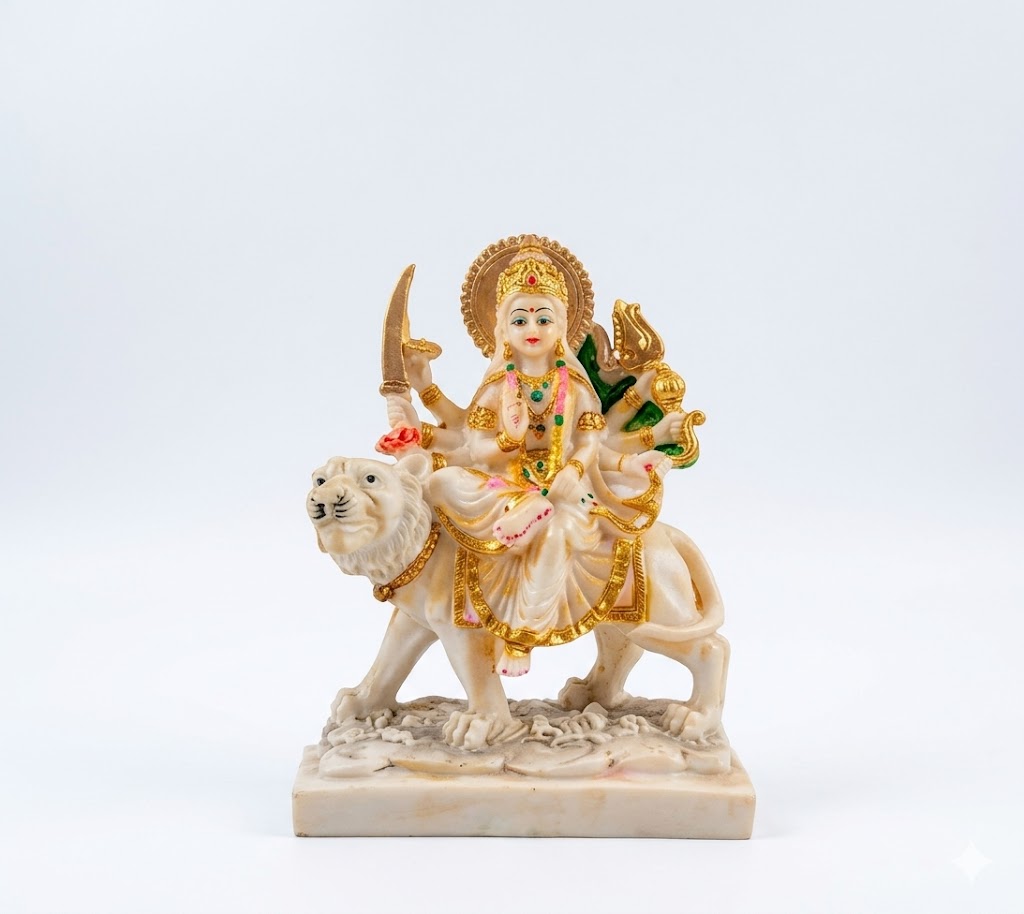 The idol features a soothing white marble-like finish, enhanced with delicate golden accents that add a touch of elegance and divinity. Maa Durga is adorned with a finely detailed मुकुट (crown), colorful ornaments, and graceful attire, while her serene and compassionate expression radiates peace, positivity, and motherly blessings.