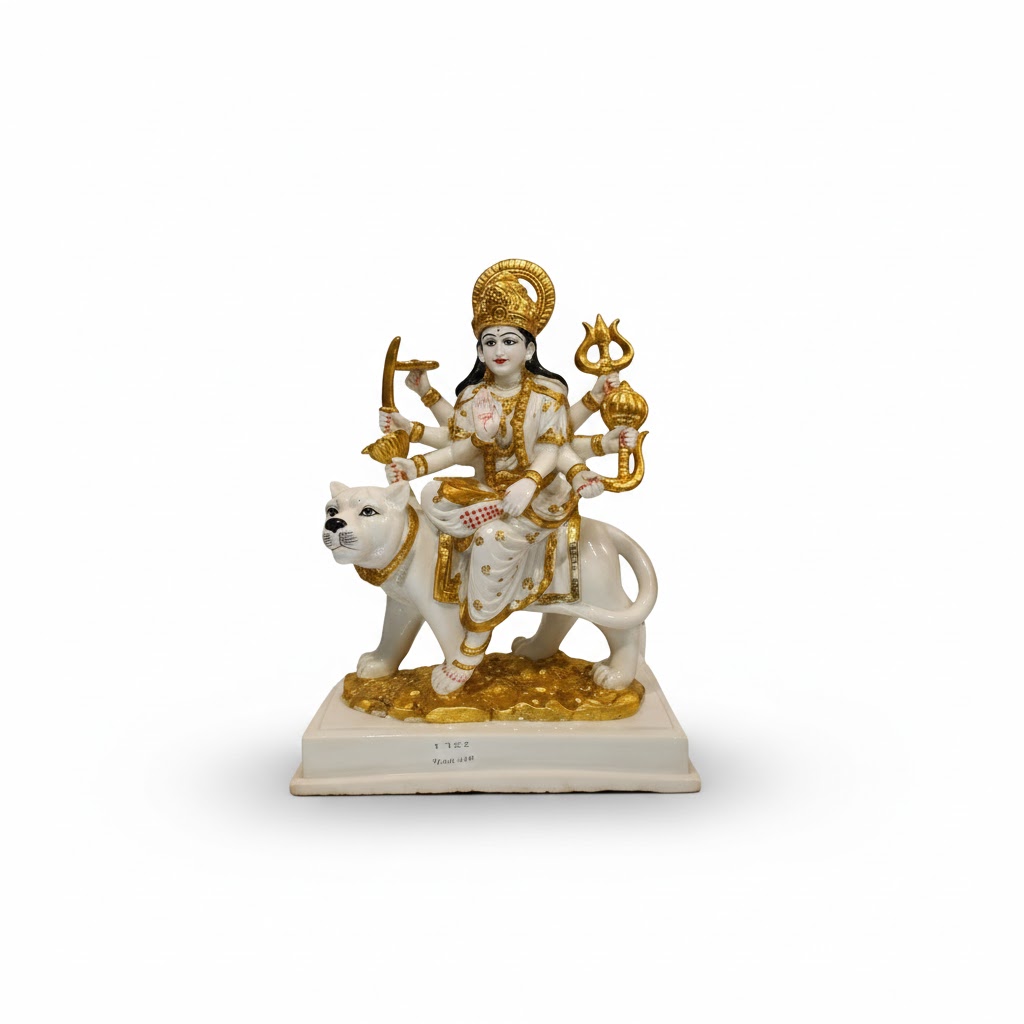 Her serene facial expression, intricate crown, and detailed ornaments reflect fine craftsmanship and devotion. The lion beneath her stands as a symbol of power, determination, and fearlessness, reinforcing her role as a warrior goddess who conquers evil forces. The golden accents enhance the richness of the piece, while the white base adds elegance and balance.