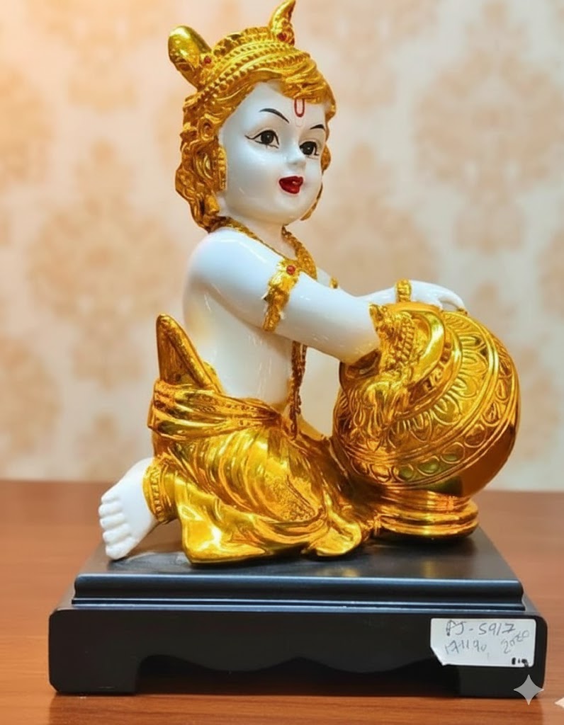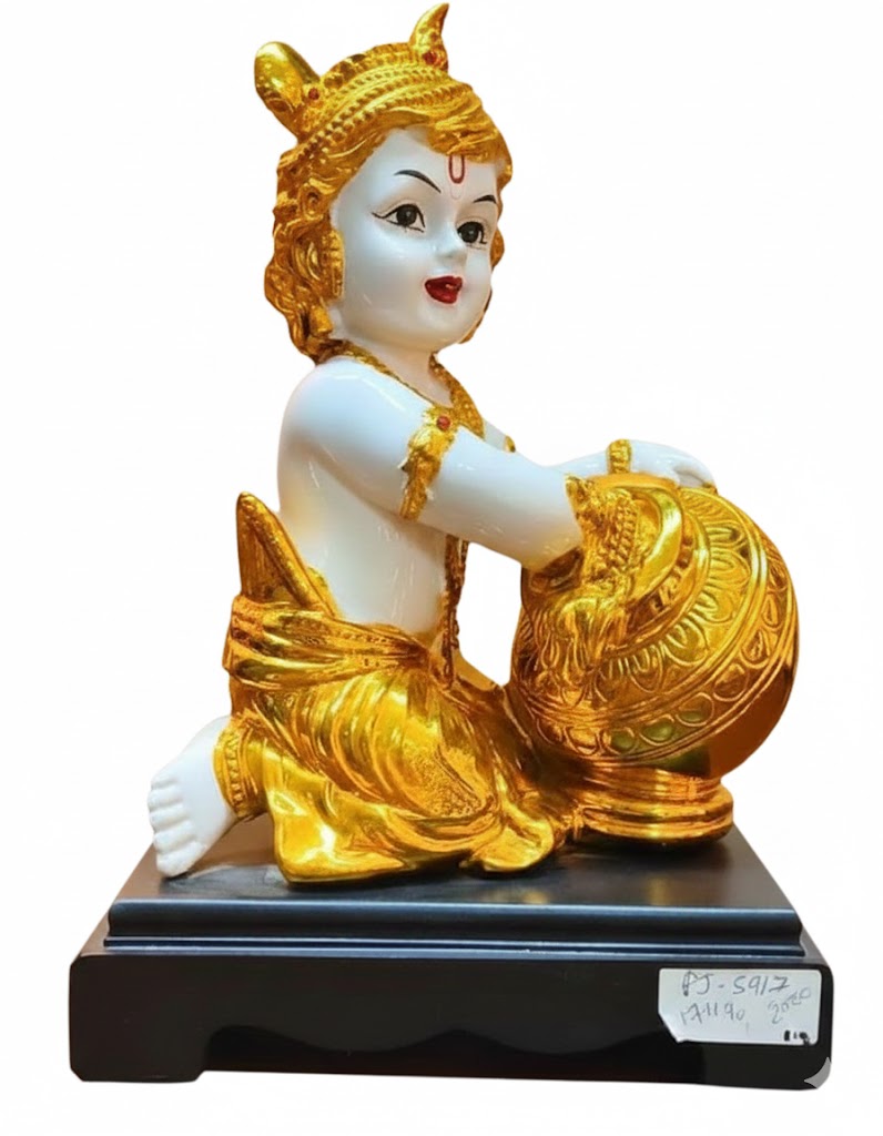 Crafted with a rich golden finish, the idol radiates elegance and grandeur. The intricate detailing on the crown, ornaments, attire, and butter pot highlights superior craftsmanship and artistic finesse. The expressive facial features and graceful posture bring life to the idol, while the sturdy base ensures stability and enhances its premium look.