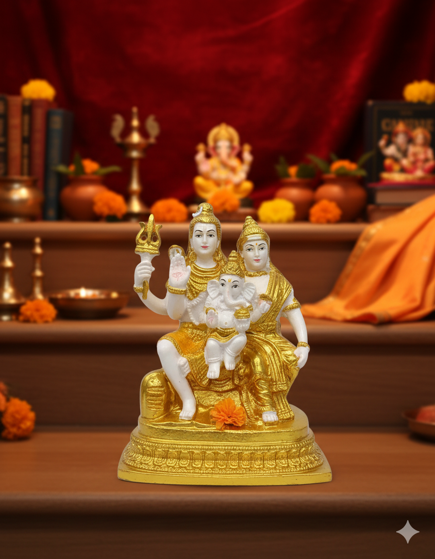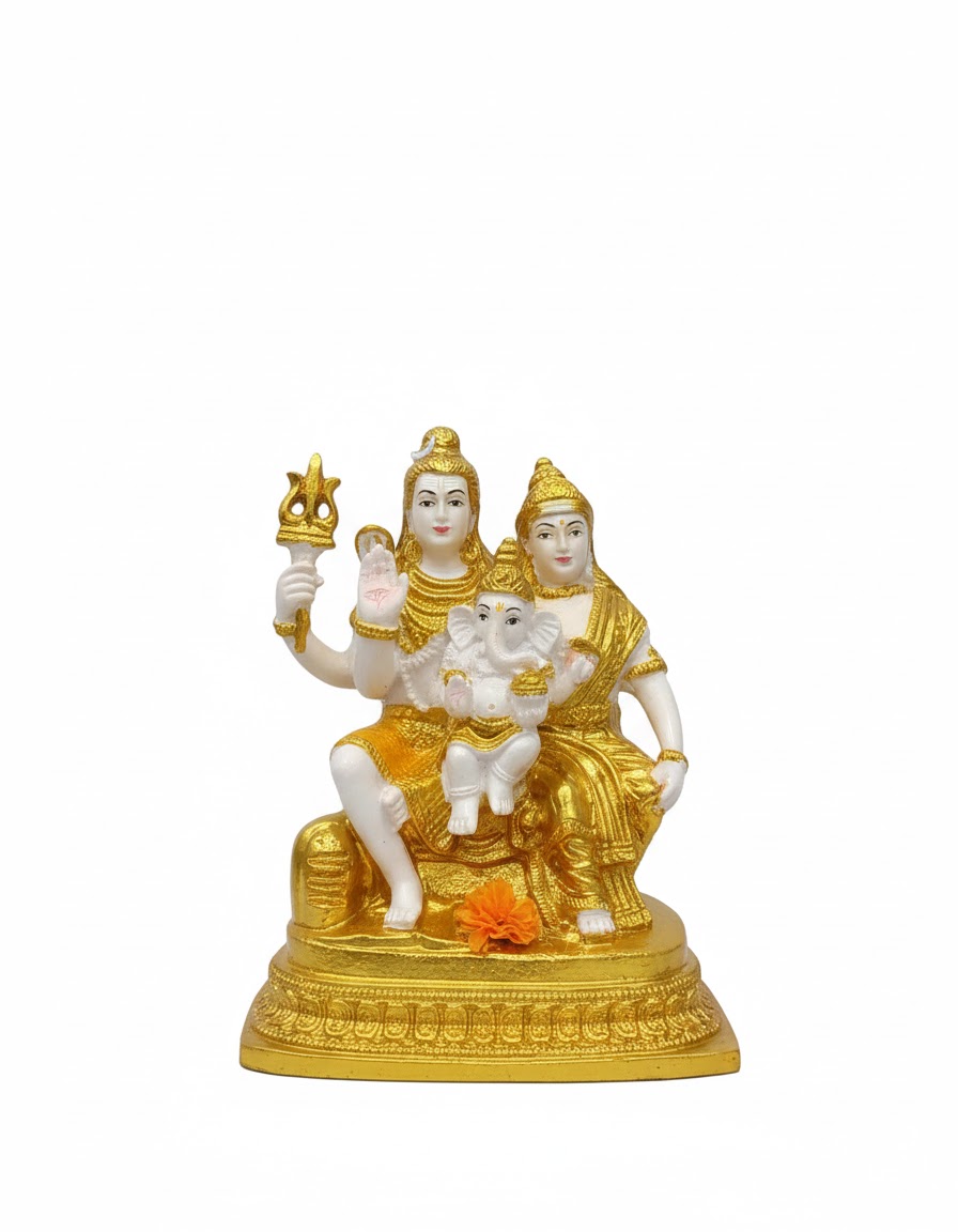 Designed with a premium marble-like white finish and enhanced with elegant golden detailing, the idol exudes a rich and spiritual aura. Lord Shiva is depicted holding his trishul, symbolizing power and protection, while Goddess Parvati represents love, grace, and nurturing energy. Young Lord Ganesha seated between them adds charm and signifies wisdom, success, and the removal of obstacles.