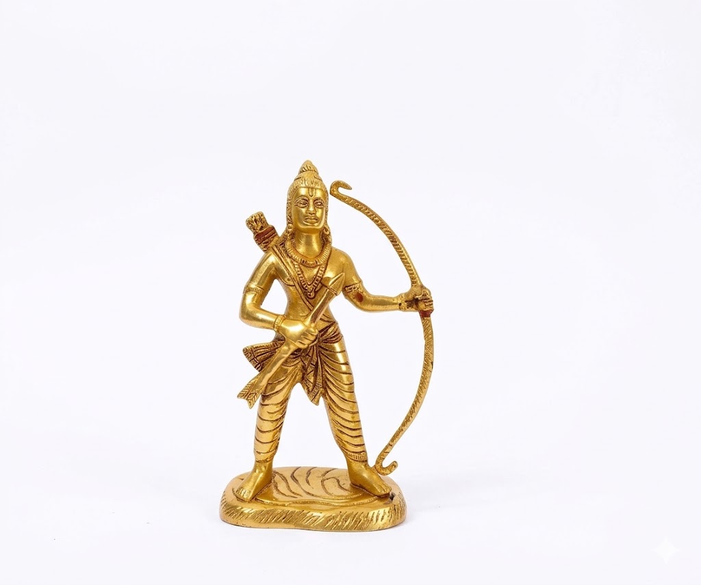 This beautifully crafted golden idol of Lord Rama captures the essence of divine strength, righteousness, and grace. Depicted in a poised stance with a finely detailed bow in hand, the sculpture symbolizes courage, discipline, and unwavering devotion to dharma. The figure showcases Lord Rama as the ideal warrior and king, embodying calm confidence and spiritual authority.