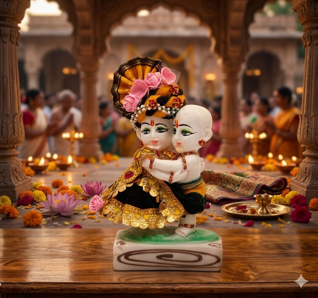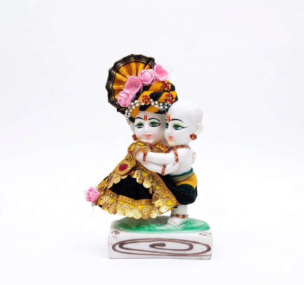 Their facial expressions are serene and expressive, with soft features and gentle smiles that radiate love, peace, and spiritual bliss. The posture of the figures emphasizes closeness and affection, making this idol a powerful symbol of unconditional love and devotion.