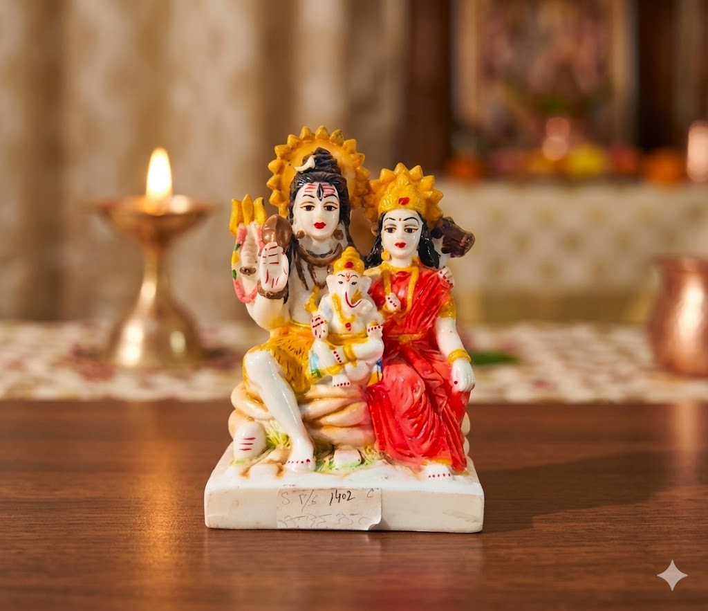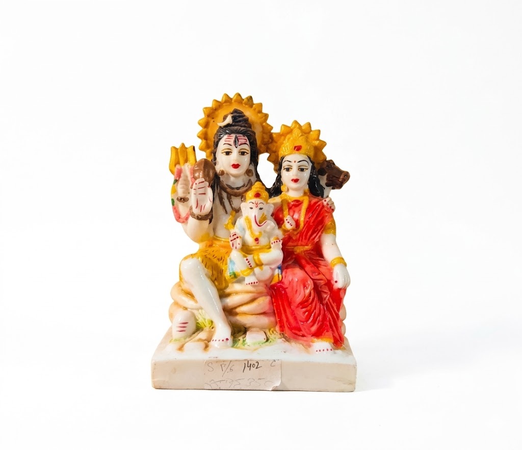 Invite divine blessings and family harmony into your space with this beautifully crafted idol of Lord Shiva, Goddess Parvati, and Lord Ganesha—collectively known as the sacred Shiv Parivar. This elegant statue depicts Lord Shiva seated calmly with his trident (Trishul) and serene expression, while Goddess Parvati sits gracefully beside him in vibrant attire, symbolizing शक्ति (strength) and compassion. Young Lord Ganesha, the remover of obstacles, is lovingly seated between them, representing wisdom, prosperity, and शुभारंभ (auspicious beginnings).