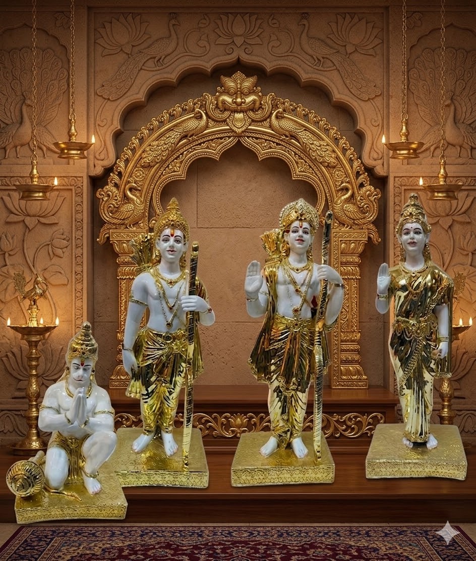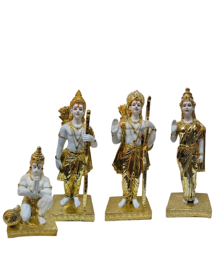 Made with a premium marble-like finish and adorned with rich golden detailing, each idol reflects fine craftsmanship and intricate design. Lord Rama and Lakshman are depicted holding bows, representing courage and dharma, while Goddess Sita stands with elegance and purity. Lord Hanuman, in a kneeling posture with folded hands, showcases devotion and humility.
