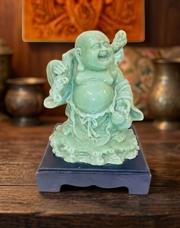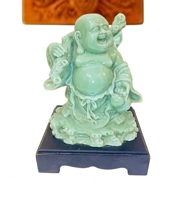 Elevate the energy of your space with this exquisite Jade Green Laughing Buddha. Carved with intricate detail, this figurine captures the iconic symbol of joy, contentment, and prosperity. The Buddha is depicted with a radiant, wide-mouthed smile, carrying a sack of wealth and traveling beads, signifying the gathering of good fortune and the removal of sorrows.