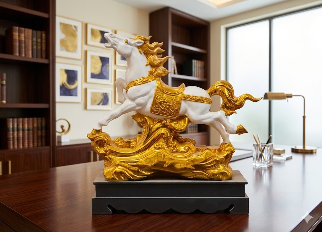 Crafted with premium quality materials, the glossy finish and intricate patterns on the saddle and base give it a royal and classy look, making it a perfect centerpiece for your office desk, living room, or showroom display. The dynamic galloping posture represents speed, growth, and positive energy—ideal for attracting success in business and career.