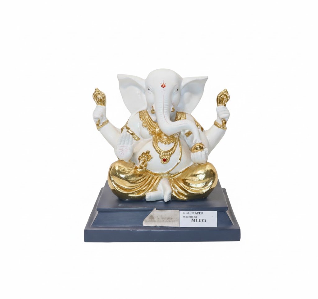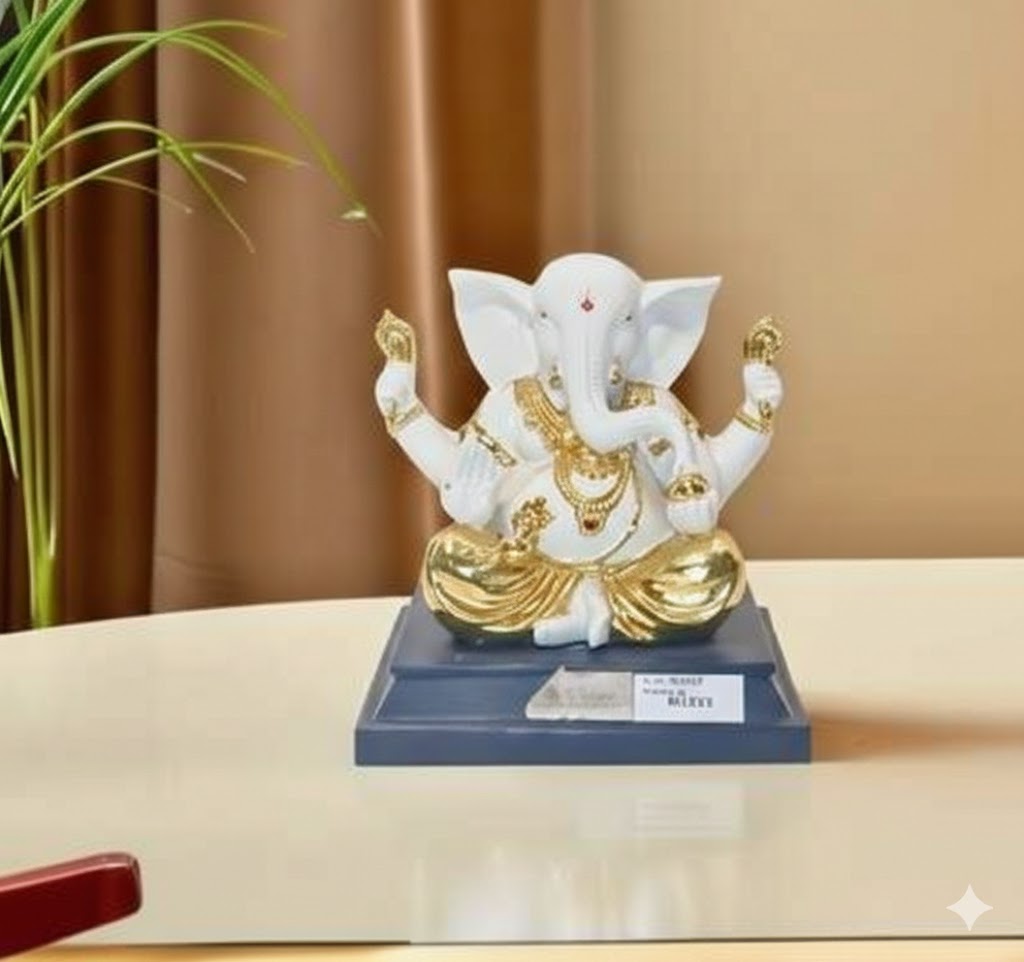 This is a beautiful, handcrafted figurine of Lord Ganesha, designed to bring an aura of peace and prosperity to any space. The idol features a pristine white finish accented with intricate gold-toned detailing on his ornaments and dhotis, creating a striking contrast that feels both traditional and modern.