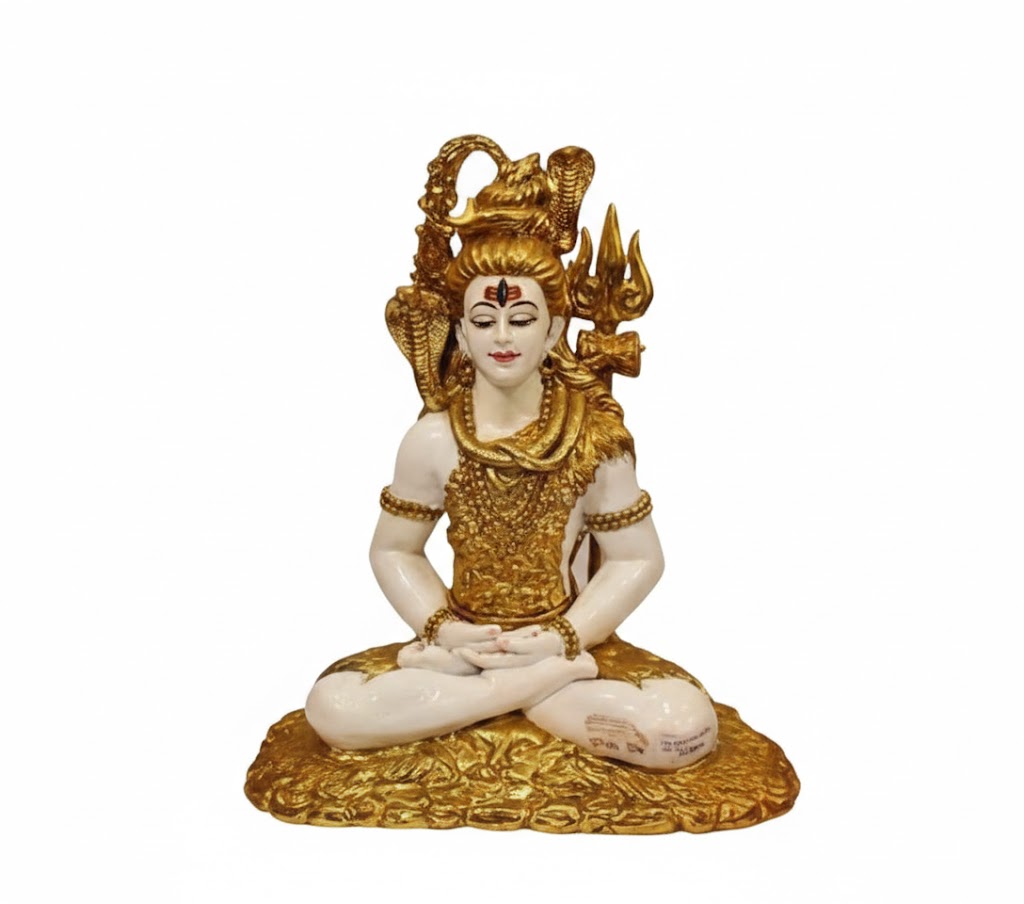 Exude a sense of profound peace and grandeur with this 16-inch Meditating Shiva Idol. This masterpiece features a striking contrast between a pristine white finish and opulent, heavy gold-metallic detailing. The intricate craftsmanship on the Trishul, the Sheshnaag around the neck, and the ornate golden armor captures the essence of Lord Shiva in a state of deep Samadhi.