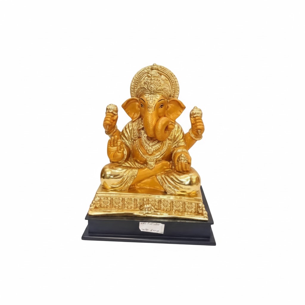 The statue depicts Ganesha, shown in a seated posture with his distinctive elephant head and human body. It has a golden finish, giving it an elegant and auspicious appearance. Ganesha is portrayed with four arms, each typically holding symbolic items that represent wisdom, prosperity, and protection. His calm and serene expression reflects peace and positivity. Such statues are commonly placed in homes, temples, or offices, as Ganesha is believed to be the remover of obstacles and the deity of new beginnings.