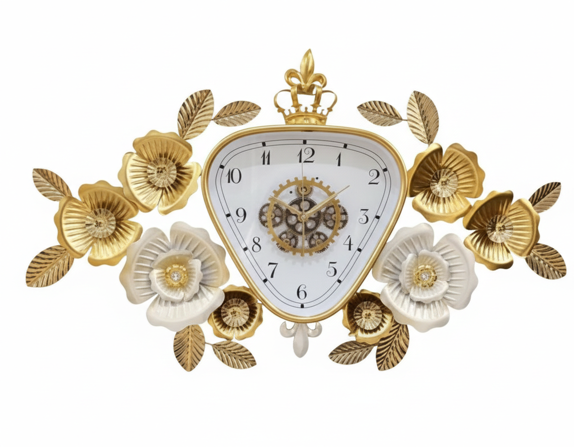 This is a premium, wall-mounted luxury clock featuring a unique triangular-shield face and intricate floral metalwork. It blends a vintage aesthetic with modern mechanical details, making it a standout decorative piece for a living room or office.