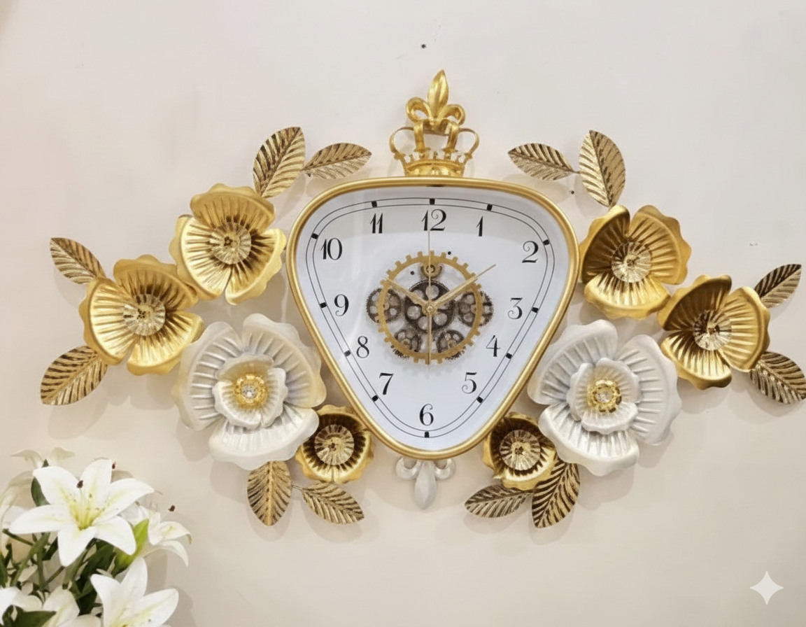 Ornate Embellishments: The clock is crowned with a regal tiara/fleur-de-lis motif at the top, emphasizing a “Bollywood-level” luxury feel.