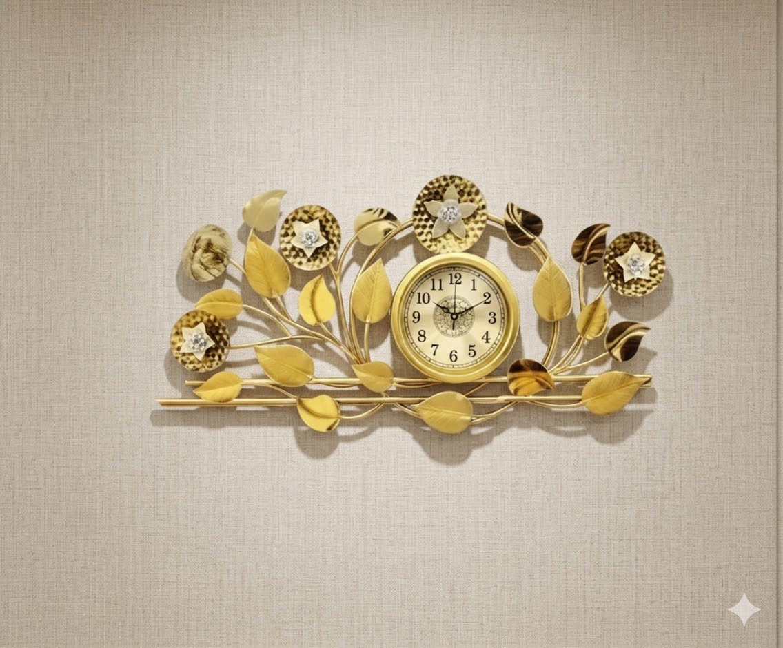 Aesthetic: The clock features a leaf-and-vine motif, with golden leaves of varying sizes blooming outward from a central timepiece.